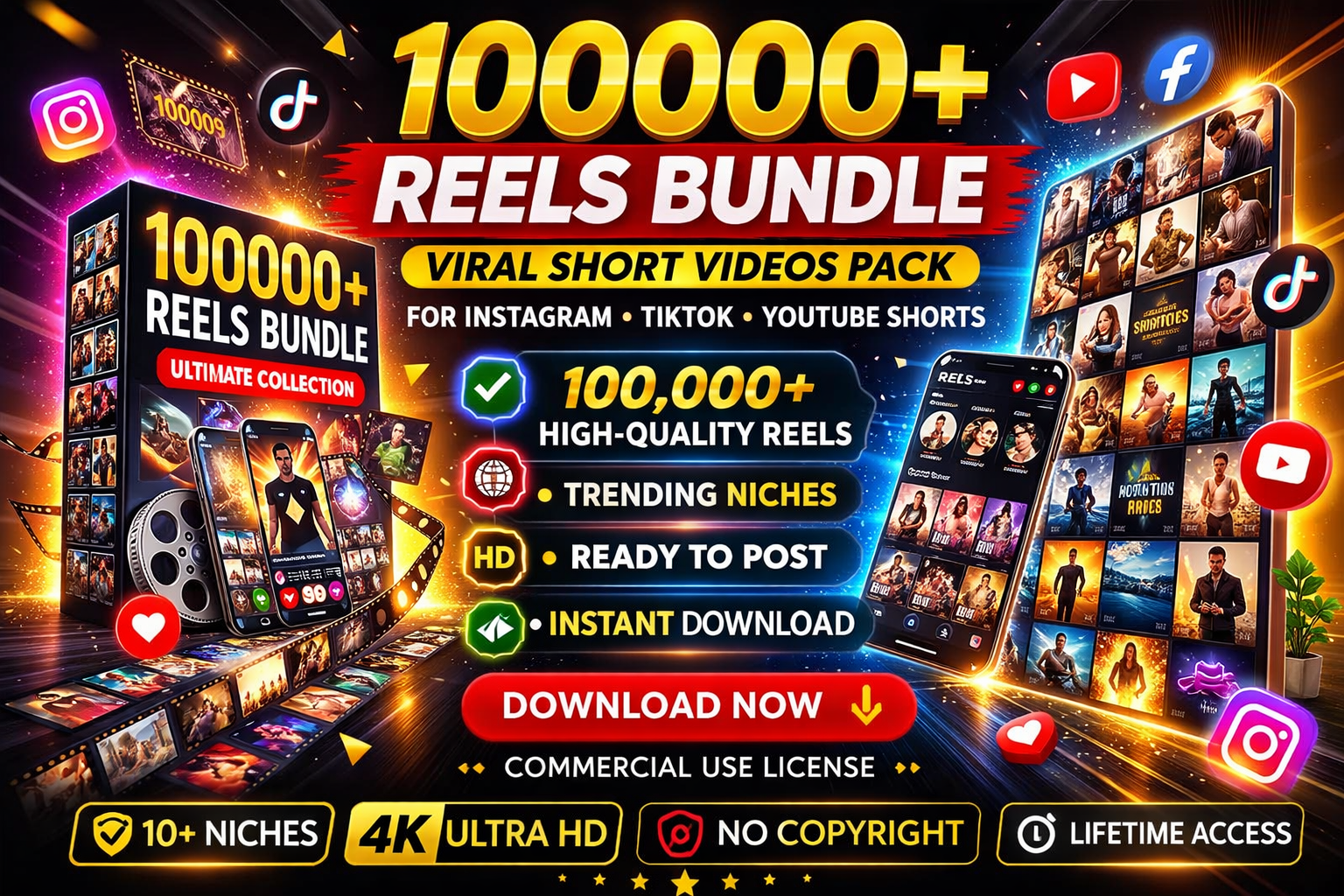 Introducing the 100000+ Viral Reels Bundle, the ultimate digital asset pack designed to help you grow faster on Instagram, TikTok, Facebook Reels, and YouTube Shorts.